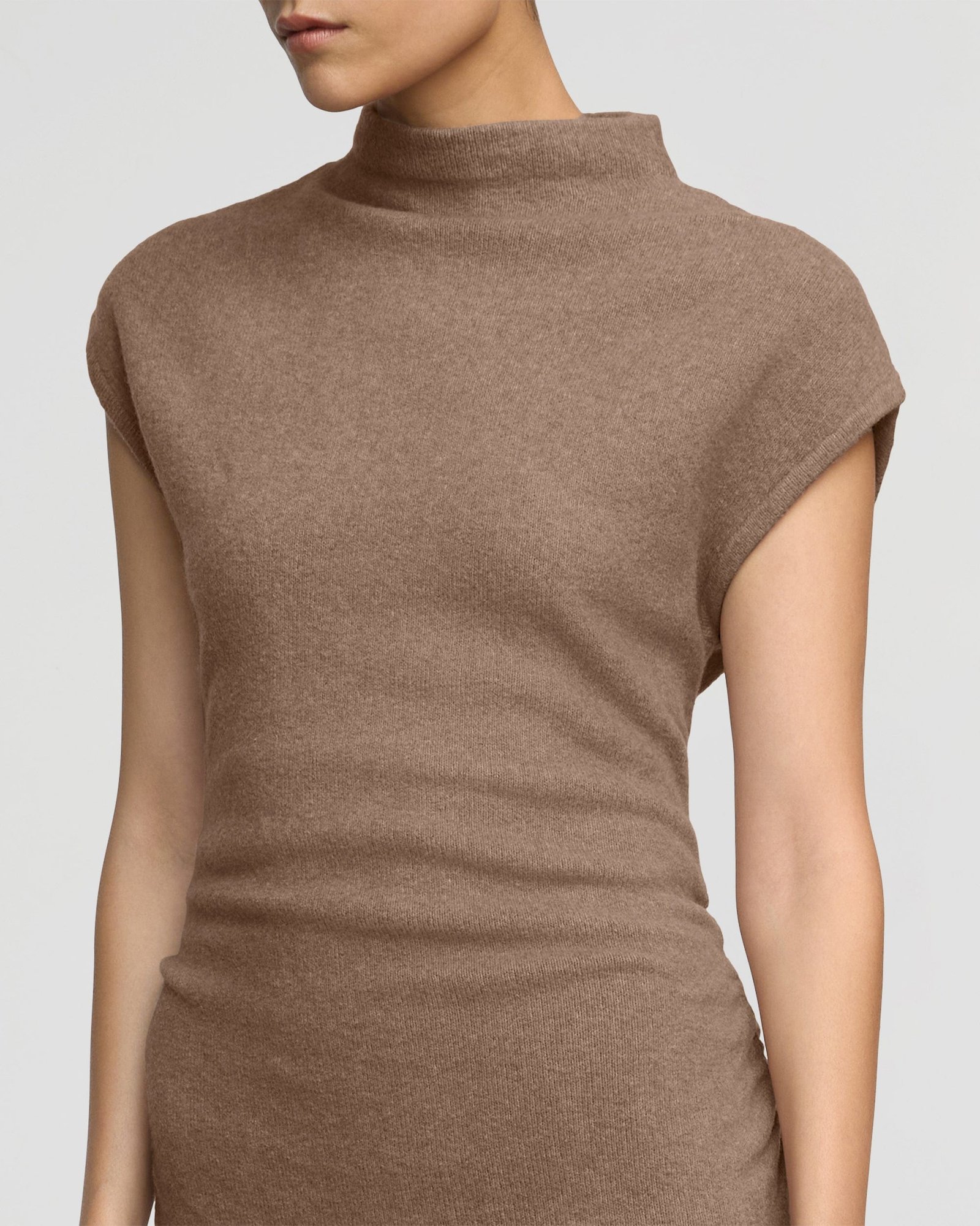 A cozy and chic mock-neck sweater dress featuring ruched side seams.  Made from a super soft eco-conscious knit, Caspia effortlessly combines comfort with style.