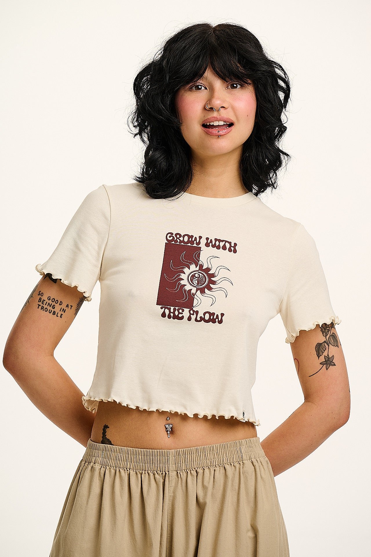 Greta is our cropped t-shirt with a lettuce edge detail. Perfect for layering.