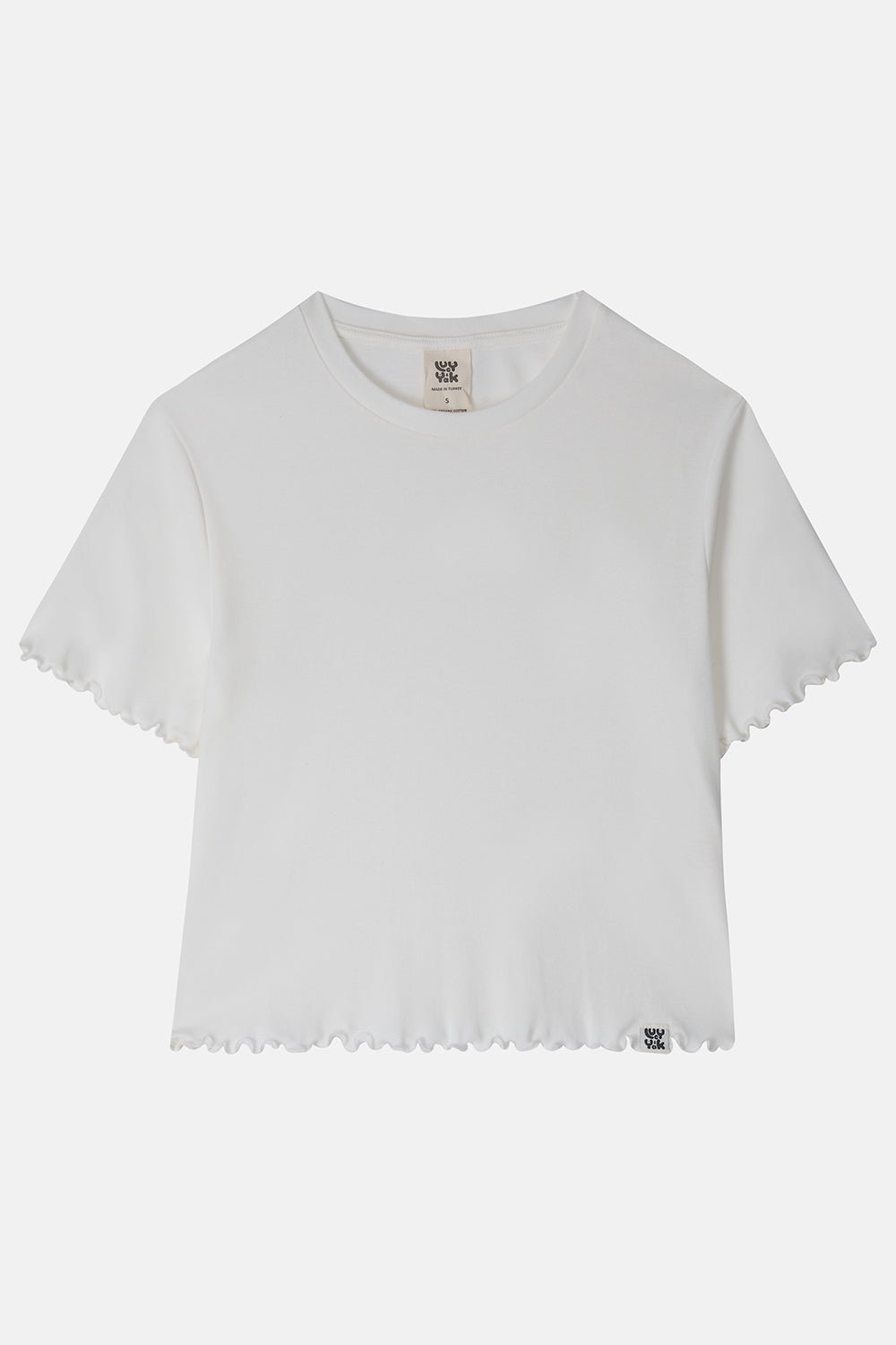 Greta is our cropped t-shirt with a lettuce edge detail. Perfect for layering.