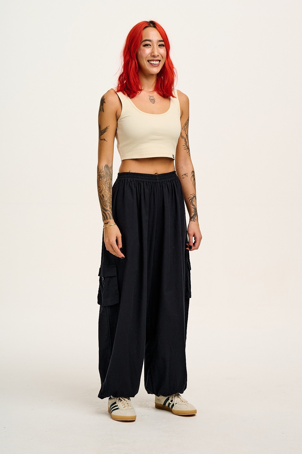 - Wide full length leg with roomy hips and elasticated cuff at hem