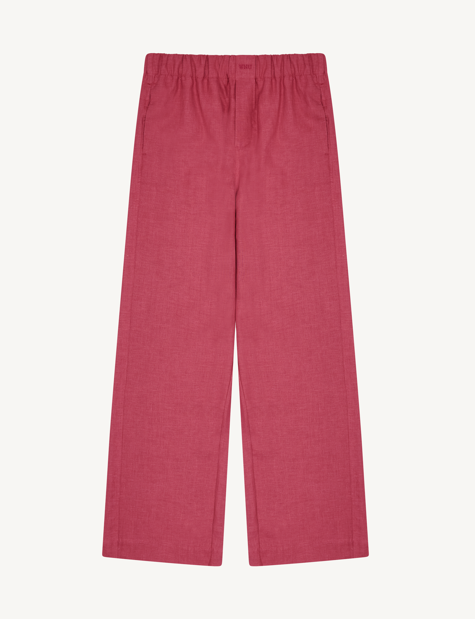 The Palazzo: Hemp, Raspberry in 100% Hemp. The perfect casual trouser designed with leisure in mind, both easy and effortless, with an elasticated waistband and pockets. Wear as a Co-ord Set with matching Weekend or style simply with an easy white tee and trainers.