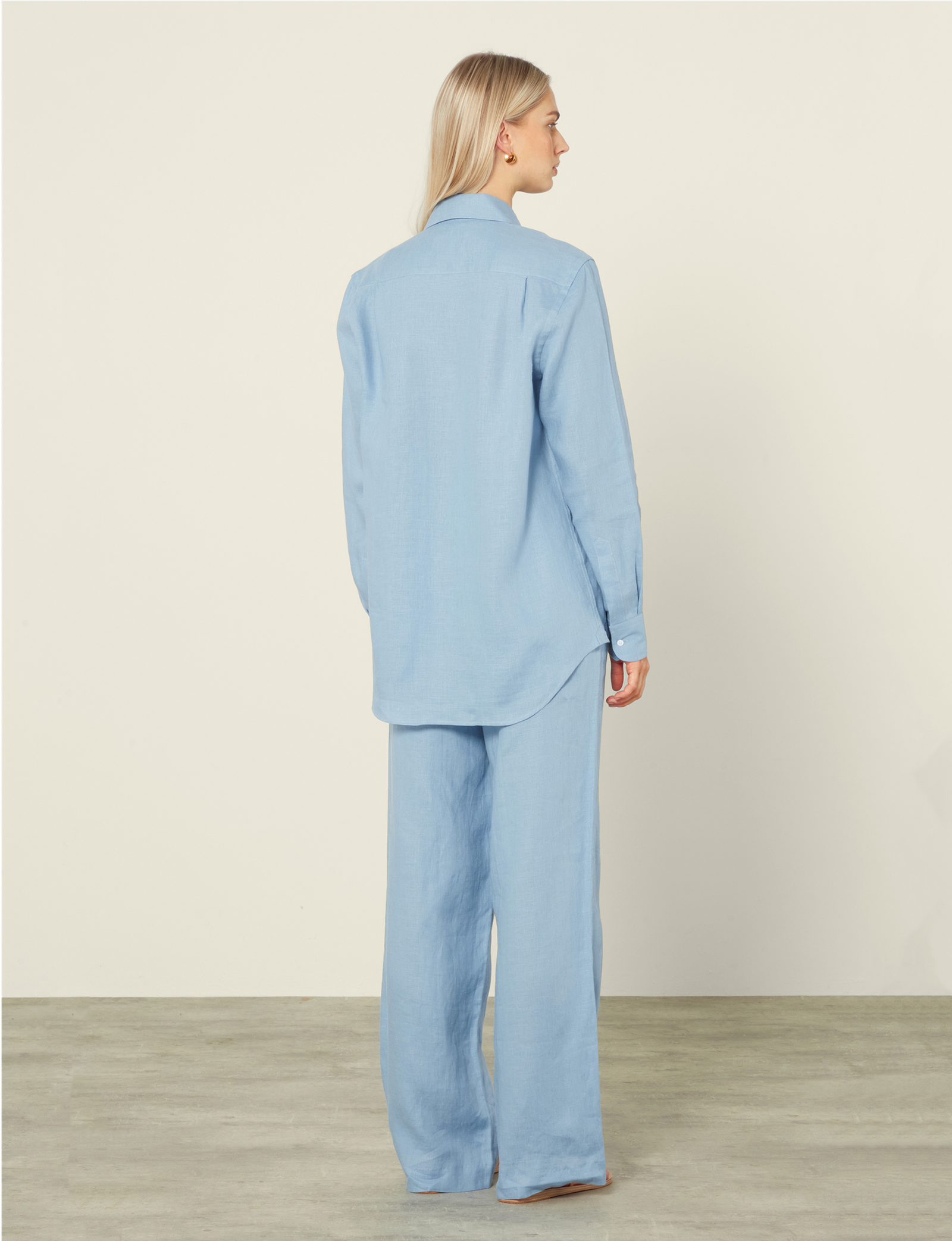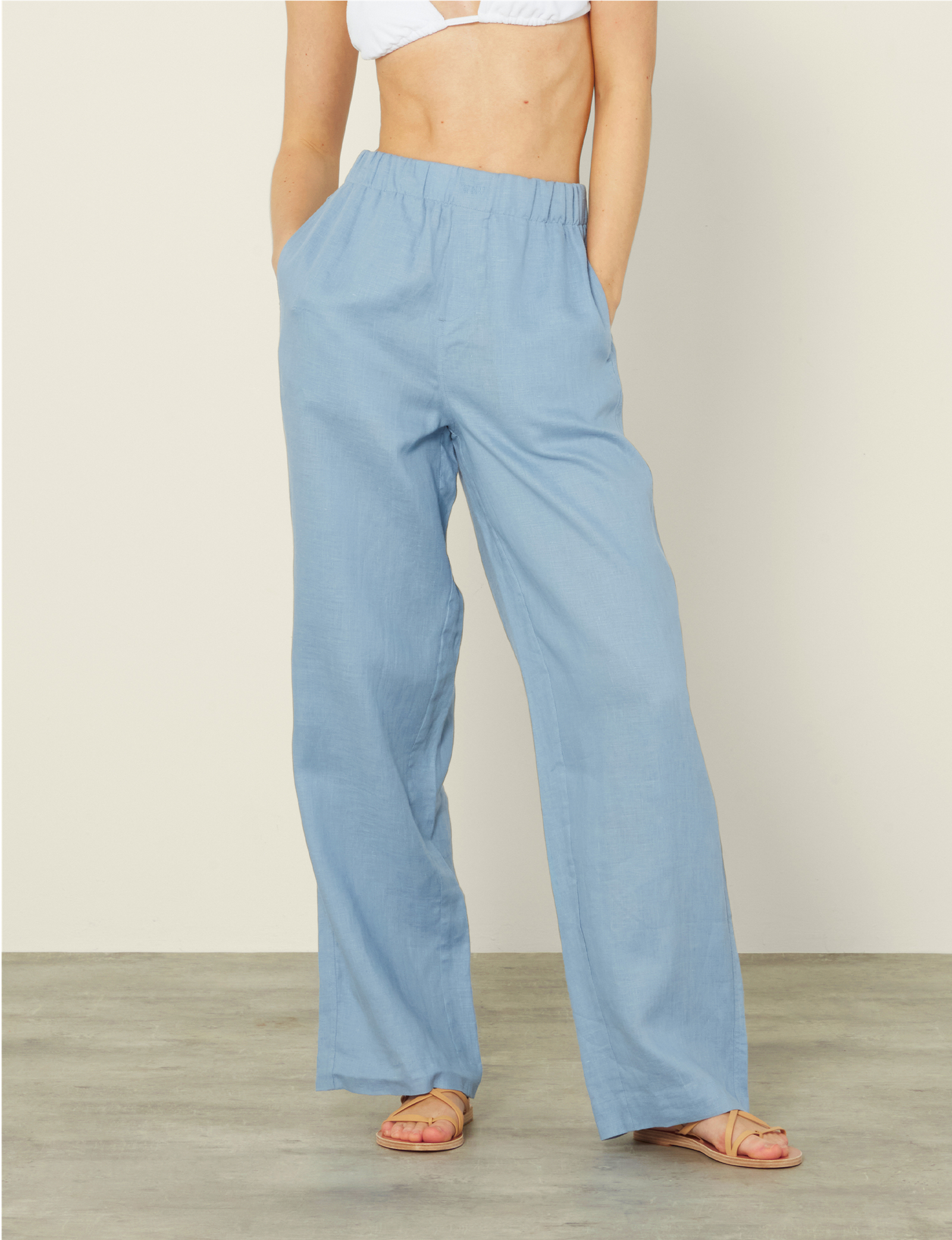 The Palazzo: Linen, Storm Blue in 100% Linen. Designed with casual wear in mind, the palazzo is an easy everyday trouser, made with an elasticated waistband and two pockets. Simply wear them as a co-ord set with the matching or style these relaxed trousers with a staple white t-shirt and trainers for a day-to-day look.