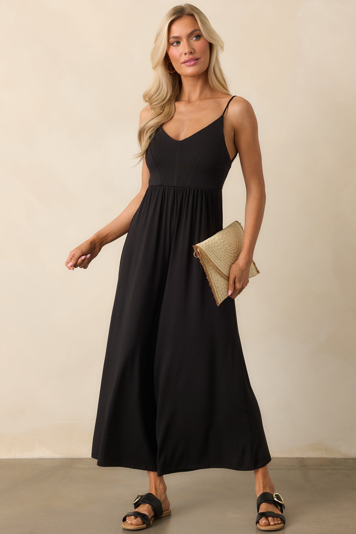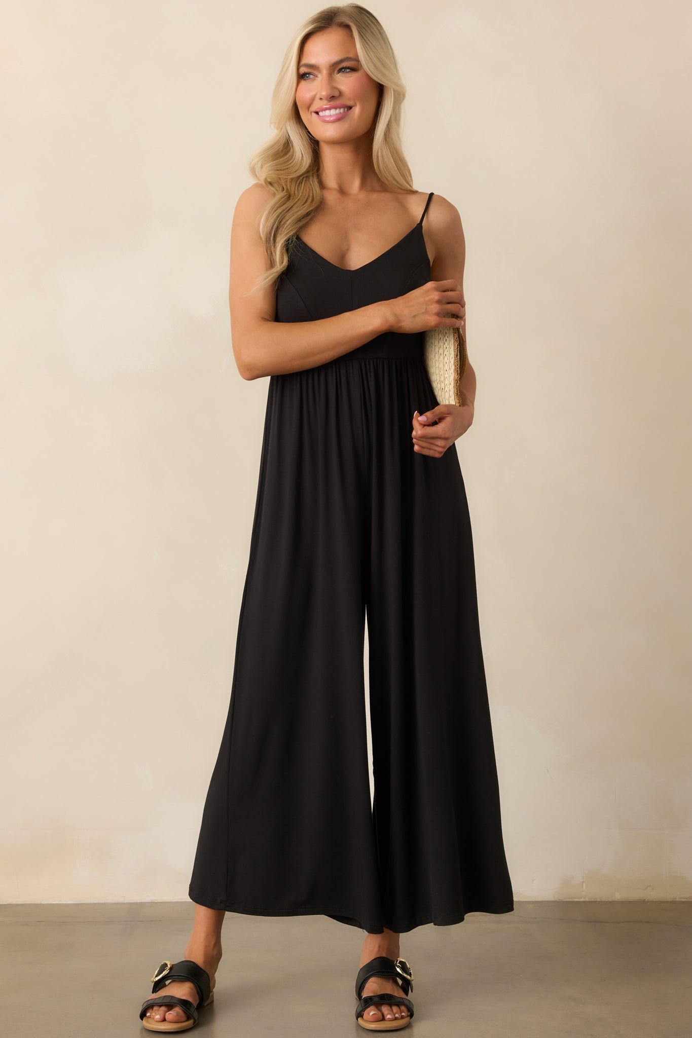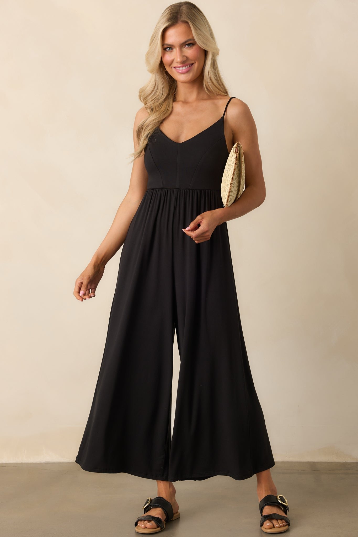 Unleash your inner fashion rebel with the Z-Supply Roz Black Jumpsuit. This versatile piece features a sleek black design, perfect for any occasion. The comfortable fit and stylish look will have you feeling confident and ready to take on the day. Say goodbye to boring outfits and hello to effortless style! This black jumpsuit features a v-neckline, thin adjustable straps that cross in the back, an elastic waistband, and a wide leg.